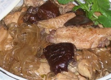 5、 放入榛蘑炖二十分钟,放入泡软的粉条继续炖五六分钟即可。