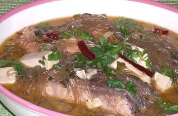 油大点,我选的是新鲜草鱼(grass carp),两面煎轻点,撒一点醋盖上锅焖一下,随后加入料酒,酱油,几粒花椒,几个干红辣椒,一头拍碎的大蒜, 一大勺糖,一点点盐, 加高汤或水没过鱼,盖上锅小火炖十分钟左右,加入粗粉条再炖五分钟左右,撒上香菜就可出锅了.