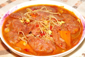 3. 炒锅烧热放辣椒油, 蒜, 姜, 泡椒炒香放料酒,加水烧开, 放入香肚, 豆芽菜,上盖转中火烧10分钟左右, 放入胡萝卜, 适量盐, 花椒粉大火收汁即可