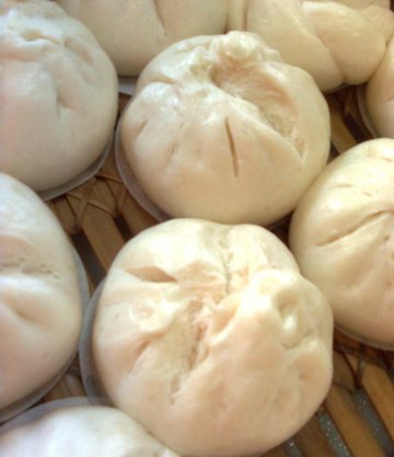 2)墊包子紙,排在蒸籠裡,盖好,把笼子置放在一旁温暖处,如灶炉旁。过了15~20分钟后才开始在蒸锅内烧1500~2000cc的开水。水内加1~2大匙的白醋, 这样蒸出来的包子皮才不会发黄。等蒸鍋内的水燒大滾后(大约10分钟时间),把叉燒包上籠用猛火(火要猛, 水蒸汽要多,才能把包子蒸炸开口)蒸10分鐘即可, 注意蒸笼盖子要盖紧密,别漏气。
