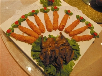 (6)取直径约80厘米的不绣钢大盆一个,铺一层烧红的木炭(约8厘米厚),码入包好的鸽子,上面再盖一层烧红的木炭(8厘米厚),45分钟后扒出乳鸽,用剪子修去突出的腿骨和翅骨,装盘即可。
