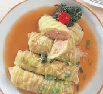 4.将作法2的馅料分别包入高丽菜叶,排入盘中,淋上调匀的调味料c,放上香菇片及红萝卜末,以强微波加热7分钟后,再改以中微波加热8分钟即可。
