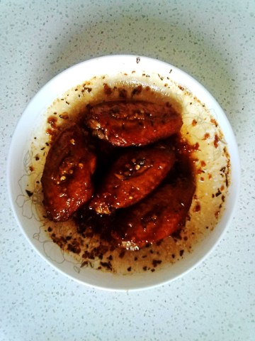 鸡中翅四个,料酒、生抽、姜末、紫苏、盐、干辣椒子、十三香、黑胡椒、蜂蜜
