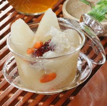2)把发好的燕窝撕成细丝后放入炖盅,加入红枣和冰糖,入锅小火炖1小时即可。这些可分六次饮用。
