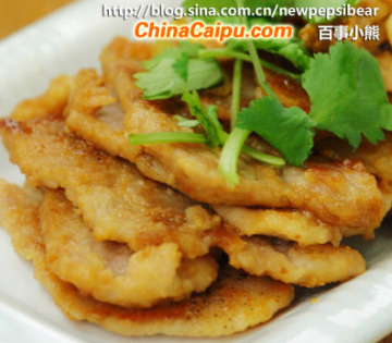 3.煎炒锅放入宽油,烧至四成热时,将肉片下勺滑开,倒入漏勺(勺内不留底油),再把肉片倒入煎炒锅煎塌,使两面呈金黄色时,把葱姜丝,香菜段撒在肉片上,泼人兑好的汁水,最后撒花椒面,翻勺装盘即成。