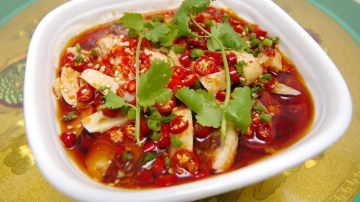 4、锅洗净加入红油烧至8成熟,将干辣椒节,花椒入锅里炝香至变色后炸在盘里撒上葱花即成。