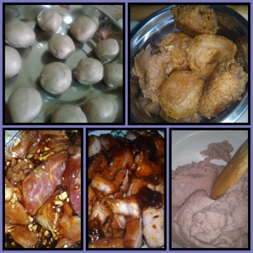 3.将外皮包上适量的叉烧馅,并搓揉成兵乓球状。再放进热油中炸至尽黄色。