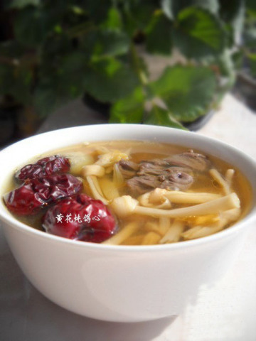 黄花菜干100克 全小鸽子 500克 红枣 生姜 香油 胡椒 淀粉 盐 味精