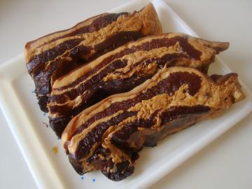 3.热油锅,放两匙油爆焦那三支青葱(取味),即熄火让油冷却后捞出青葱放进馀下的五香粉一匙,老抽一匙,生盐一点,糖一匙,味精一点拌匀后,再匀塗在切开的排骨之间(留下一点汁),而五花肉的皮面上则用梳打粉薄薄的塗上一层以利于烤时鬆化与出油.