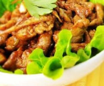 5,锅内倒入适量的橄榄油,加入姜丝大火爆香,然后倒入里脊肉片快速的翻炒,炒至变色,然后浇上碗汁,继续翻炒收汁即可。