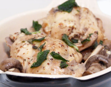材料:整兔一只切八块,蘑菇200克,大蒜两瓣,鸡汤150毫升,白葡萄酒100毫升,奶油3大勺,法国黄芥末1汤勺,橄榄油2汤勺,盐、胡椒适量,欧芹、百里香一捧