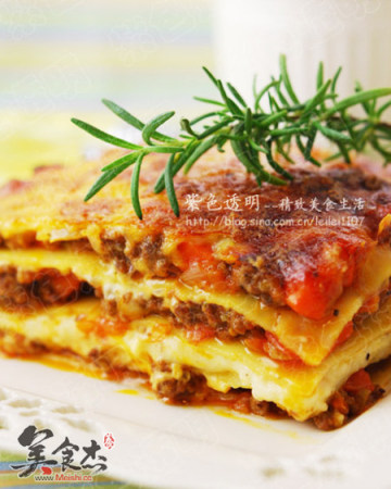 牛肉馅250克面皮4张小麦面粉25克牛奶220毫升马苏里拉100克奶酪4片洋葱1个西红柿2个胡萝卜半根调料食盐1茶匙番茄酱3汤勺橄榄油适量百里香1枝迷迭香1枝红酒适量白糖1茶匙黄油25克豆蔻1/4茶匙黑胡椒1.5茶匙奶酪粉半茶匙触碰食材图片可获得购物信息哦!