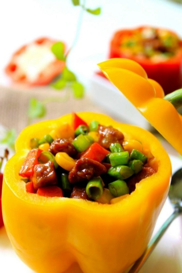 8 彩椒外面用盐水刷洗干净,另外用干净的砧板和刀切去顶部,作为盖子,去芯,