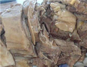 2、切块、煮制:取宁夏特产羯羊宰杀后,去内脏、头、尾、四肢再切成1千克左右的大块,投入开水锅中加花椒、小茴香、八角、桂皮和杏仁、陈皮等调料,盖锅炖煮,待炖至提羊骨一抖,骨肉分离时即可取出。