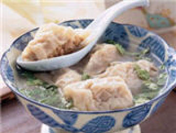 3、锅内放清水,烧沸后,将馄饨生坯下锅,用铁勺背部靠着锅边和锅底轻轻推动,以防馄饨粘在一起。待馄饨浮起后,加些冷水再煮片刻随即捞起盛入碗内(碗里事先放好鲜汤和猪油)。