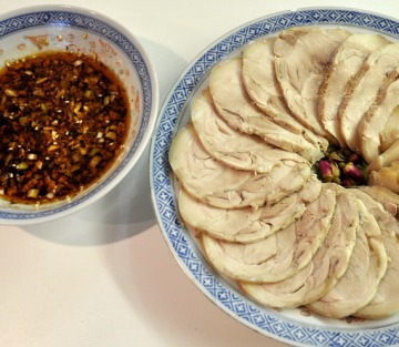 5、吃的时候拆去保鲜膜,将猪肉切片摆入盘中,配蘸料食用。