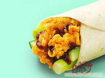 2、肯德基中的墨西哥鸡肉卷,和老北京鸡肉卷的做法一样,不过就是将黄瓜、大葱和甜面酱换成了生菜、西红柿、洋葱和沙拉酱。
