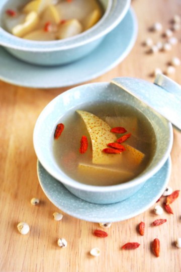 雪花梨半个,川贝3g,冰糖10g,枸杞1g