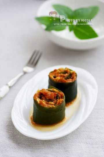 (1)、将海带洗净,切成6-8厘米见方的片。猪瘦肉剁成泥,葱、姜切成末,面粉加水调成糊。猪肉泥中加葱、姜、芝麻碘盐、料酒、鸡精、清汤搅拌成馅。海带抹上馅料,将其卷成直径1.5厘米的卷,用面糊粘牢。