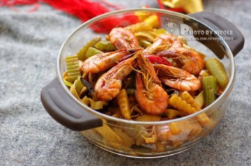 煸炒出香味后,倒入文字步骤(2)中炒好的香料和油,下入虾和鲜贝,然后放入其余