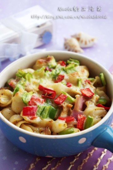 18、贝壳粉中撒奶酪丝,再撒上剩余的青、红椒,烤箱220度预热,放入烤箱中层,烤15分钟即可。