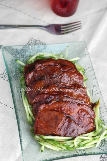 梅花肉,黄瓜,生抽,老抽,白砂糖,蜜汁叉烧酱,料酒,白胡椒粉,鸡精,姜