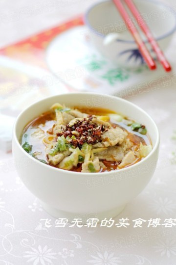 里脊肉200克,青菜50克,葱15克,姜15克,玉米生粉1茶匙,料酒1汤匙(15ml),盐2克,生抽1茶匙(5ml),油2茶匙(10ml),盐1茶匙(5克),生抽1汤匙(15ml),料酒1汤匙(15ml),胡椒粉2克,白糖3克,辣椒油20克