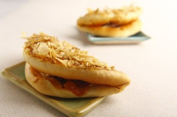 9.将作法7的大阪烧盛入盘中,在表面涂上猪排酱,再挤上适量沙拉酱,最后撒入柴鱼片及海苔粉即可食用