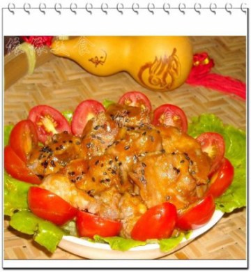 10.生菜叶子铺在碟子上,把排骨盛上去,撒上黑芝麻,切小番茄装饰一下