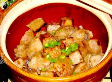 2.芋头去皮切块,放入热油炸至金黄,放入煲内备用。