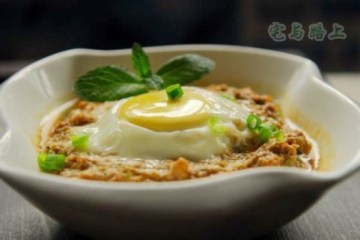 4、取一深盘,放入肉馅,铺平,中间扒开一个小洞,加入适量清水至没过肉面,打入一个鸡蛋。