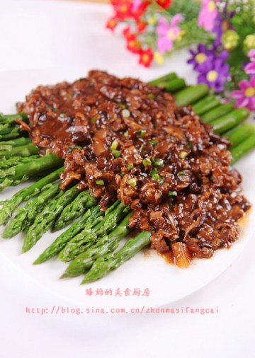 2、热油锅放入肉末炒散后,加姜末、豆瓣、生抽翻炒香,加少许的水烧开,滴几滴香油,放点鸡精,勾芡起锅,淋在芦笋上即可。