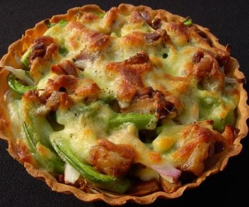 咸派皮450g,鸡胸肉200g,洋葱末30g,豌豆仁60g,蘑菇50g,奶油30g,牛奶100㏄,面粉15g,盐1/2小匙,鸡肉腌料:1/2小匙,蛋白1/2个,黑胡椒粉1/4小匙,玉米粉2小匙,蛋黄液:少许,蛋黄1个
