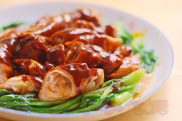 4、起镬放油放蒜头爆香,将大肠头倒入爆炒片刻,溅酒后加清水、白糖加盖煮片刻,放盐调味后勾芡盛起,铺在预先灼熟的青菜上面便成。