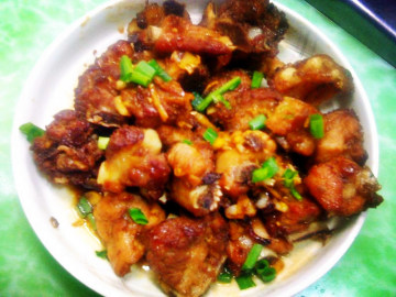 6、翻炒盛出来小排骨在盘子里,撒上一些小葱末在上面