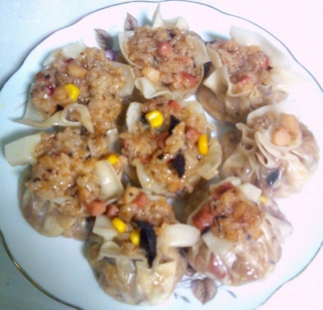 2、饭好后焖一会,待稍冷却后取一张烧麦皮(没烧麦皮用馄饨皮也行)中间放烧好的糯米饭,然后四周慢慢捏拢,上面馅料露出来没关系,用手轻轻压紧下就好了。