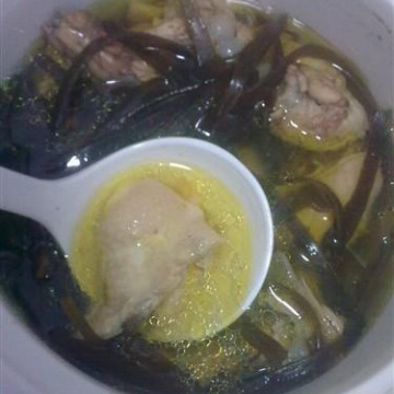 2.锅上火,放入适量水,先放入鸡肉块,烧至鸡块熟时,加入精盐、味精、料酒、葱花、姜丝、海带,烧至鸡肉熟烂时,出锅即成。