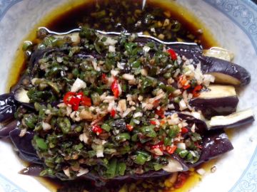1、茄子洗净,切成条状,放在蒸锅上蒸熟。青椒和小米椒在火上烤熟(成锅巴状)切成细颗粒。