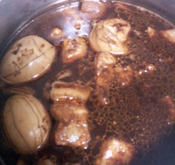 鸡蛋、猪肉、老抽、糖、姜、黄酒、水、香叶、鸡精。