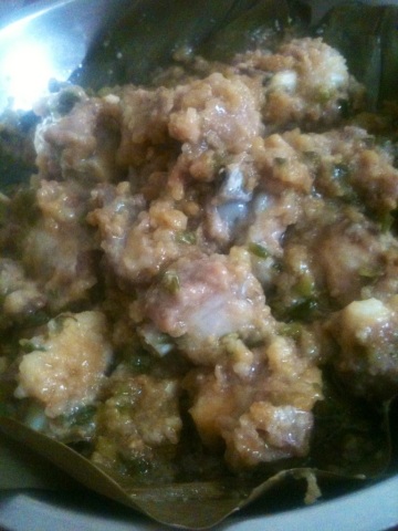 排骨250克,蒸肉粉适量,些许葱,蒜,盐,酱油,粽子叶3片。