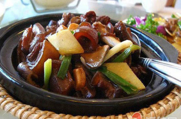 野猪肉剁块,飞水,入高压锅压10分钟,捞出,下菜油爆炒,下米酒,干辣椒,生姜,整蒜子,葱结,盐,鸡精,蚝油,酱油,加水闷入味,菜出锅倒入砂钵。