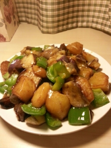 土豆、茄子、青椒、蒜瓣、高汤、酱油、盐、糖、生粉