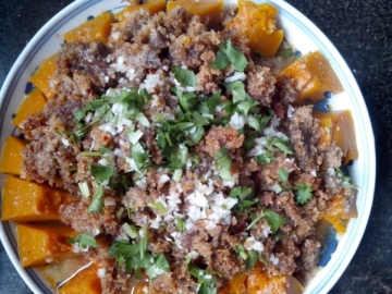 牛肉200克,豆瓣酱1大匙,酱油0.25小匙,酒适量,姜末适量,香油适量,五香炒米粉小匙,葱花适量,蒜泥适量,香菜1根,花椒面适量,南瓜0.5个