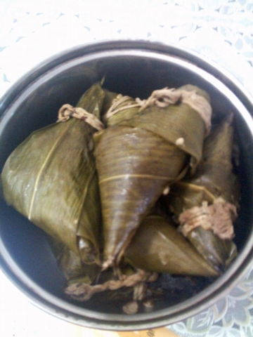 3、包好粽子锅子放满水,装满粽子大火煮2小时就好了。