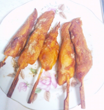 1、鸡肉串在木棍上,浸在生抽里,撒点盐和糖,腌1小时。