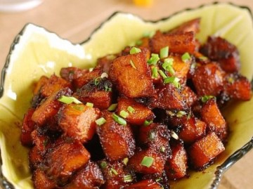 倒入烧汁,大火收汁,并不停翻炒,使南瓜丁均匀裹上烧汁