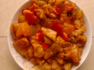 ,再加入切好的绿色和橘红色的菜椒翻炒几下,最后加入切好的菠萝和炸好的肉块。