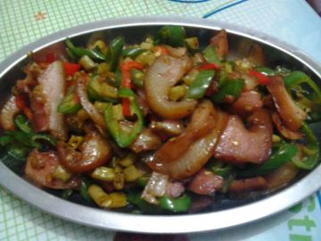 2、然后倒入切好的蒜头和姜炒香,放入辣椒一起炒熟;