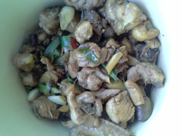 1.把鸡斩块,洗干净,用油,盐,五香粉,姜丝,蚝油和一点点生抽腌制半个小时