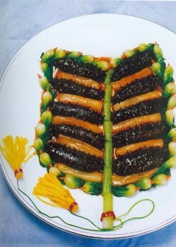 (3)、此菜呈酱褐色,海参柔软滑嫩,光泽油亮,有浓郁的葱香味。
